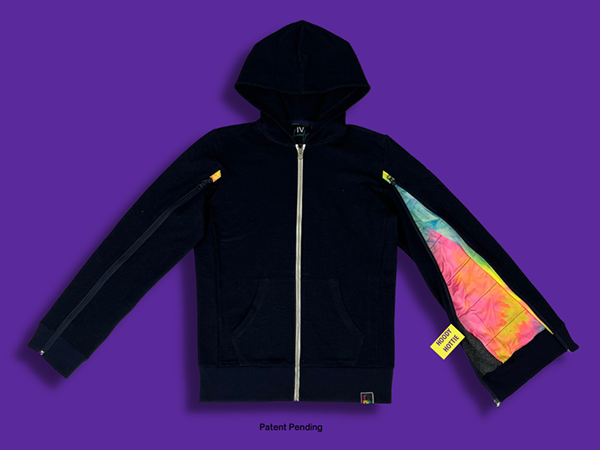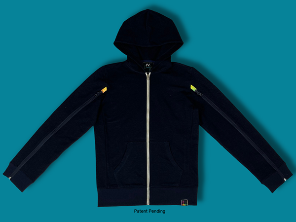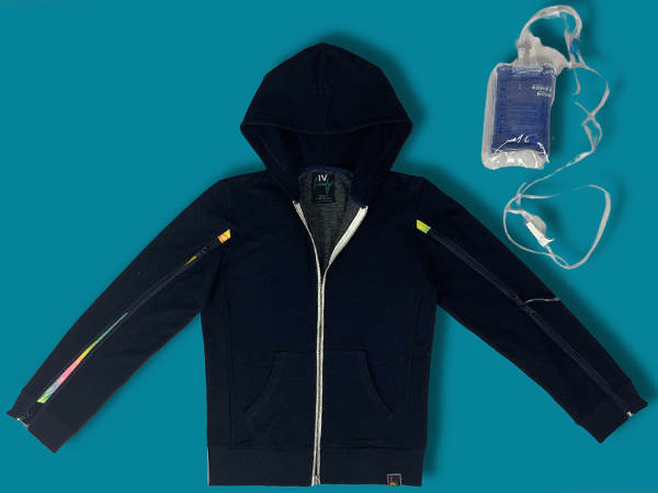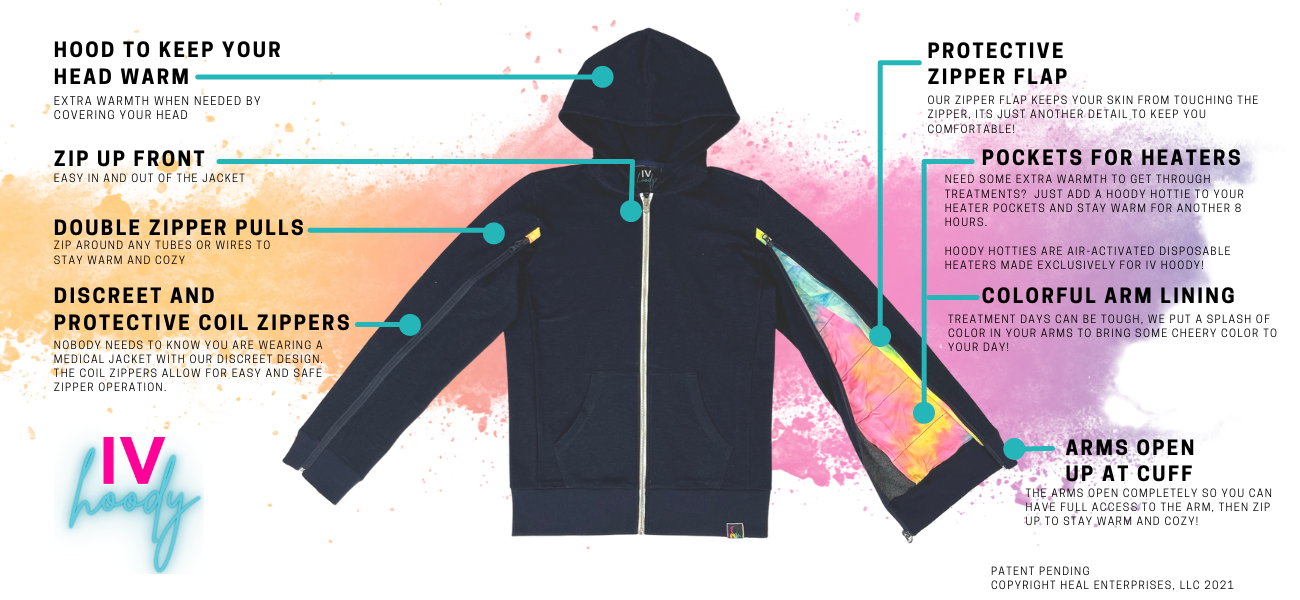 Our patent pending hoody is designed to keep patients warm & comfortable while going through IV treatments of all kinds.
